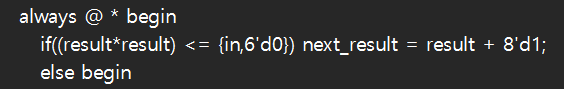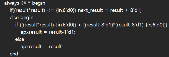 1씩 더하는 모듈을 설계하기 위해서 9비트 카운터를 기반으로 설계했다. 8비트가 아닌 9비트인 이유는 입력값이 1017~1023인경우는 2진수로 표현할 때 8비트로 표현되지 않기 때문이다. 따라서 overflow를 방지하기 위해 9비트 카운터로 비트수를 설계하였다. 1씩 더하는 카운터에서 조건이 필요하다. 조건없이 1을 더하는 것이 아닌 입력값과 비교했을 때 커질 때까지 더하는 것이므로 입력값의 제곱보다 작을 때 카운터가 1씩 더 해진다는 조건이 if 문으로 사용되야 한다. 따라서 코드상에서 구현하면 다음과 같다.