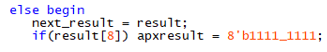 입력값이 1017~1023인 경우 이전에 설계했던 것과 동일하게 출력값이 32가 될 수 없으므로, 무조건 31.875로 근사되어야 한다. 따라서 1017~1023을 이진수로 나타낼경우 이진수의 MSB가 1이므로 result [8]=1일 때 근삿값은 항상 31.875라고 코드상에서 표현되어야 한다. 따라서 조건문을 이용해 나타내면 다음과 같다.