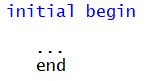 이니셜 블록은 always블럭문과는 다르게 실행할때 최초 1회만 실행되는 블럭이다. 따라서 초기변수에 초기값을 할당할때 주로 많이 사용되고 시뮬레이션 테스트벤치코드 작성에 사용되는 블럭이다.